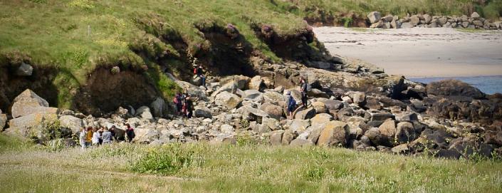 Accompagnés par Xavier Guillaumin (artiste visuelle et musicien), Juan Baztan (chercheur en sciences de l’environnement), Lionel Jaffrès (metteur en scène) ainsi que leurs enseignants, ils ont participé à mesurer la taille du Monde. Le matin a été consacré à une observation de l’environnement et à la réalisation de photos et d’installations. L’après-midi, ils ont pu observer les différentes traces de l’Histoire présentes sur l’île Carn : le Tumulus daté de -6000 ans, les blockhaus datant de 39/45 ainsi que les stigmates du naufrage de l’Amoco Cadiz. Ces éléments ont pu être mis en perspective avec les différents âges géologiques et les enjeux environnementaux pour les années à venir.