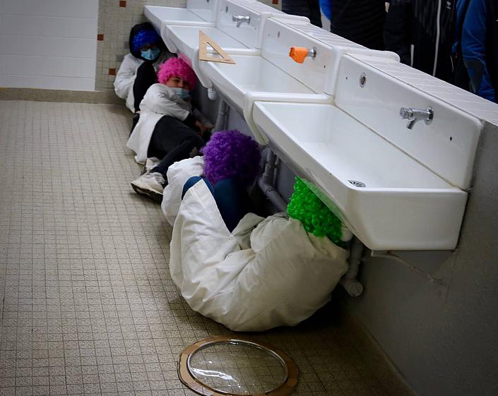 Mesurer les gens, leurs tailles, leurs âges, leurs forces, leurs renommées, leurs espaces de vie dans un texte de séquences burlesques jouées par les 5éme, dans les espaces les plus insolites du collège (toilettes, espace des casiers, ascenseur, escaliers de la cantine, etc.) ;