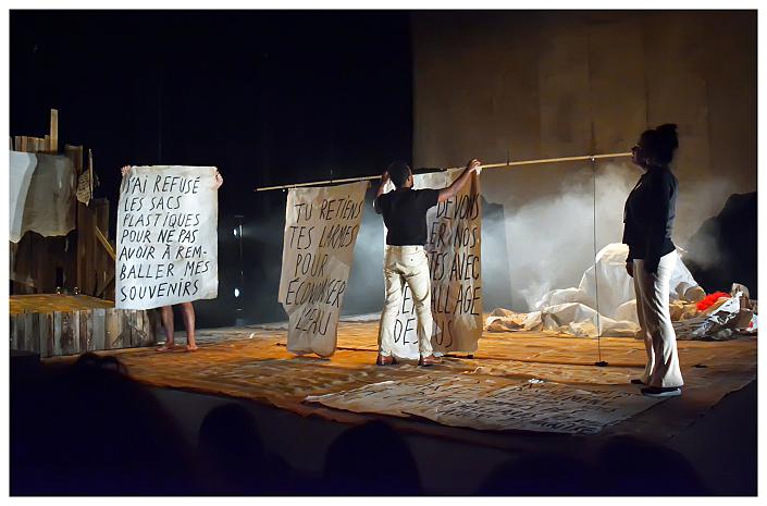 « Au plateau, 2 comédiens et 2 comédiennes évoluent dans une scénographie ingénieuse qui permet de réunir les deux espaces géographiques évoqués. La création sonore et vidéo met en relief les textes à la dimension poétique forte, qui servent un propos fédérateur qui pourrait se résumer ainsi « Fin du monde, fin du mois, même combat ».
