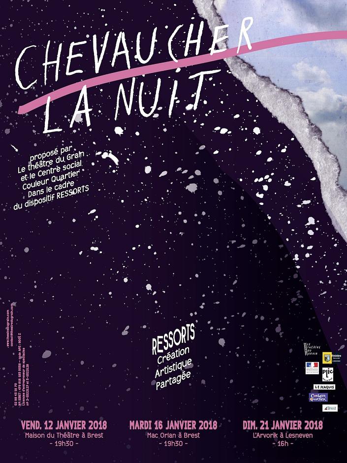 Chevaucher la Nuit, c’est dire une histoire, la nôtre, et la porter devant nous, au-delà de notre quotidien. Inscrire notre réalité dans une fiction, la déployer dans une langue poétique, inconfortable. La traiter. Bien ou mal. La transformer pour en révéler le polymorphisme. Ajourer notre réalité pour en chercher les strates. C’est, dans le bruit de cette nuit, en écouter ricocher les échos dans d’autres corps-coeurs-caboches et ensemble percevoir la présence du jour.