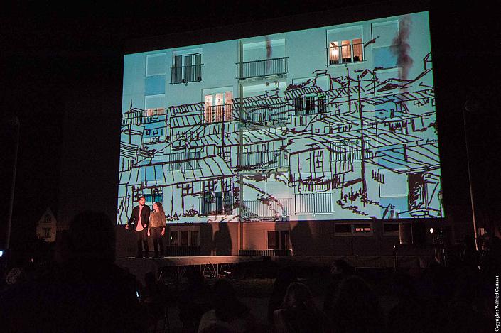Entre projections de vidéos à échelle monumentale sur un immeuble et interventions d’acteurs, chanteurs et musiciens, ce spectacle, créé en 2018, s’inspire de l’Histoire de Brest et du quartier populaire de Kerourien.