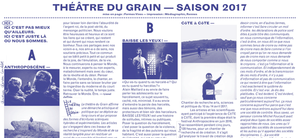 On vous le réservait pour cet été. Cette année, on vous présente notre saison, notre compagnie, nos créations, nos actions et nos inspirations sous la forme d’un journal. Et dans l’ordre d’un abécédaire. Libre à chacun de l’explorer les 26 chapitres au gré de ses envies, ou de façon méthodique. Retrouvez-le à consulter ou à télécharger par ici. La mise en page est signée Formes Vives !